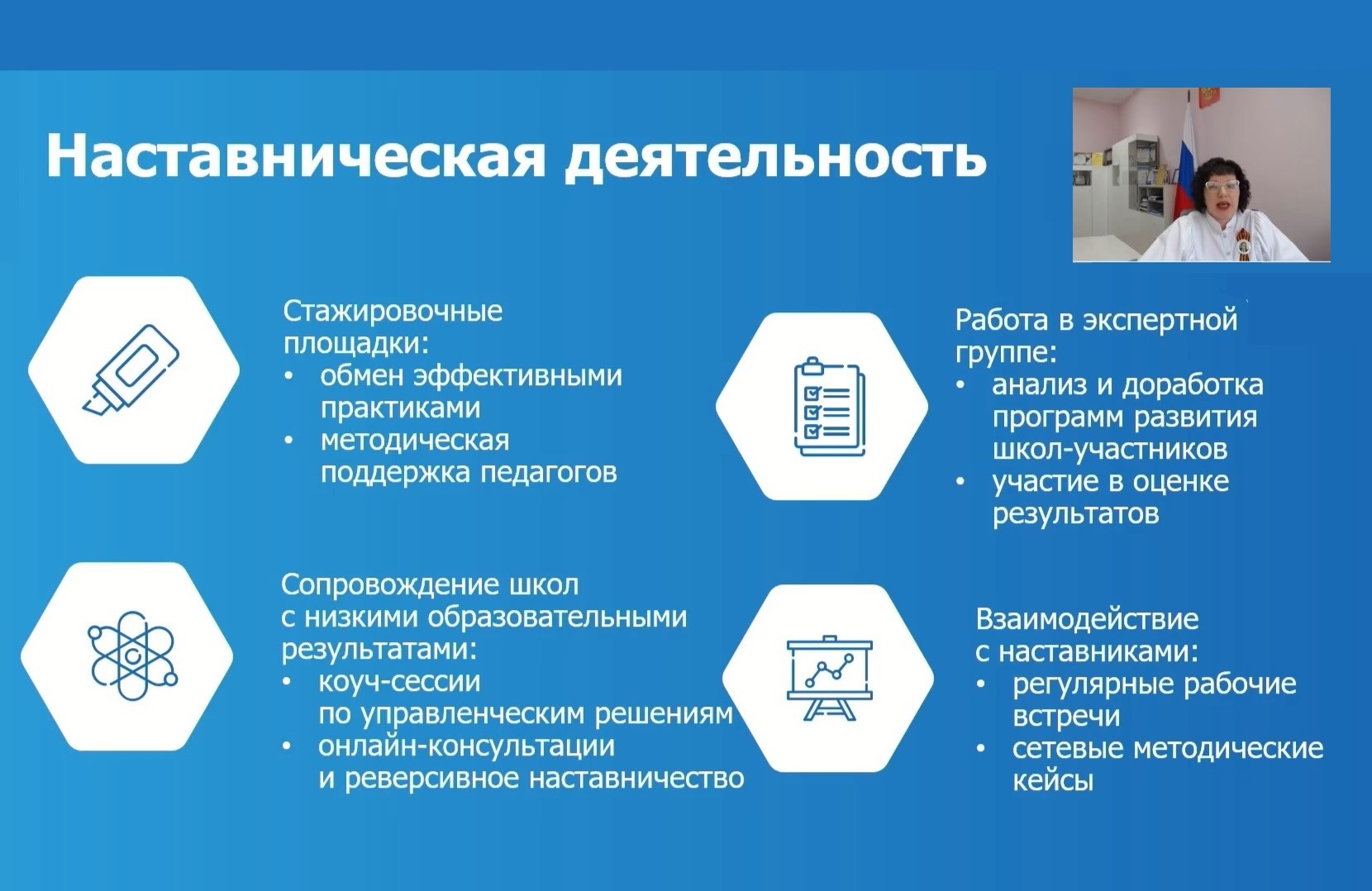 - Одной из важных задач стажировочной площадки для нас является активность участников в процессе взаимодействия, в этом нам помогаю продуктивные педагогические технологии. Участники погружаются в интерактив: обмениваются идеями в формате «встреч», а после анализируют реальные уроки, чтобы найти решения для своих школ. Все этапы нацелены на конкретные инструменты, которые можно адаптировать под условия свой школы, своей образовательной среды, - сказала в своем выступлении Юлия Юрьевна.