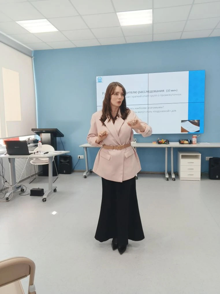 Тьютор ОНППМПР г.Тобольск Любовь Петровна Фаттахова провела совместно с «детективами» «первичные следственные действия», рассказала об алгоритме проведения анализа и обобщения исходных данных для принятия первостепенных управленческих мер, касающихся повышения упавшего качества. Участники деловой игры определили первостепенные задачи на основе дефицитов школы № X магистрального направления «Знание» проекта «Школа Минпросвещения России», представленных для детального изучения организаторами семинара.